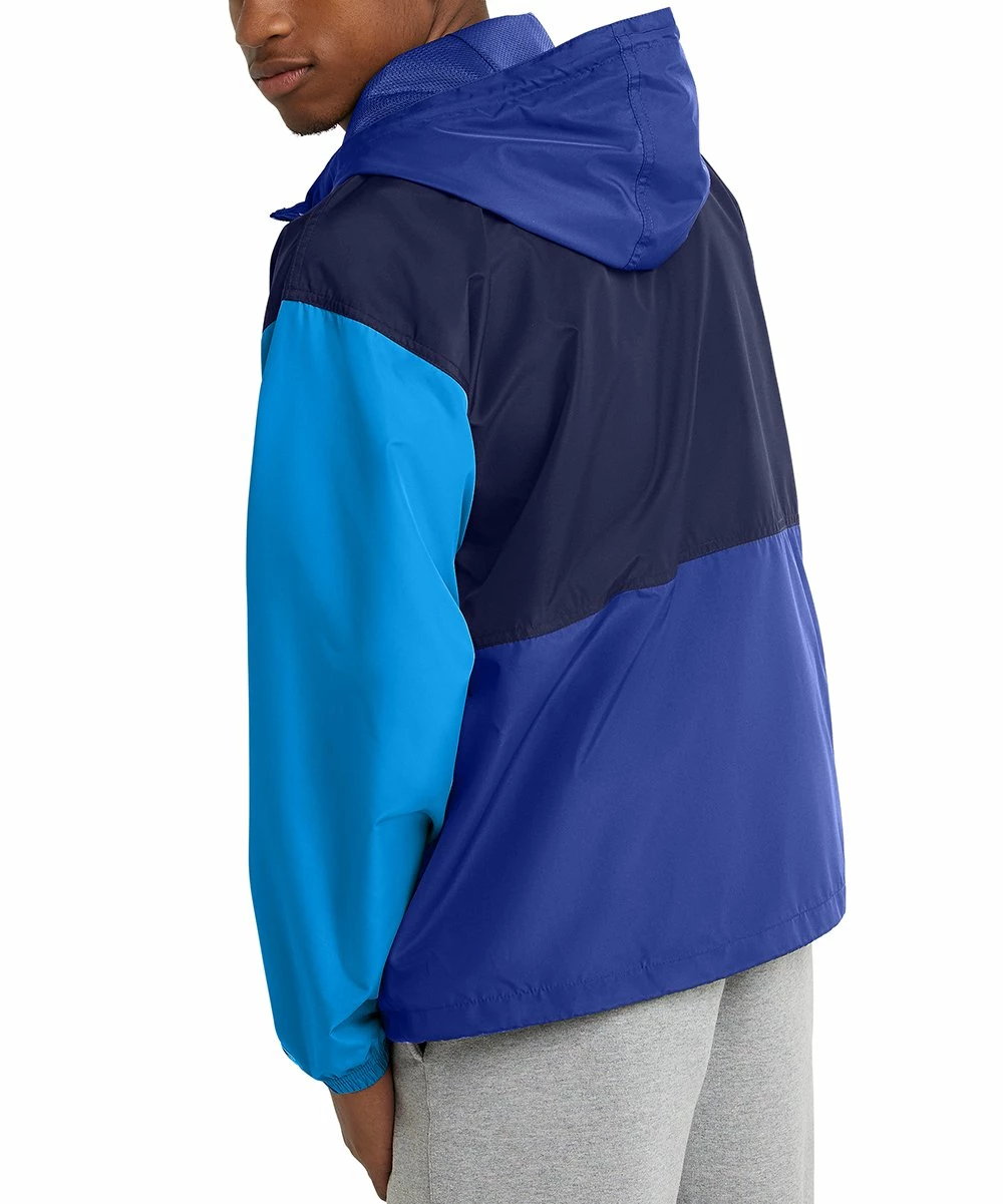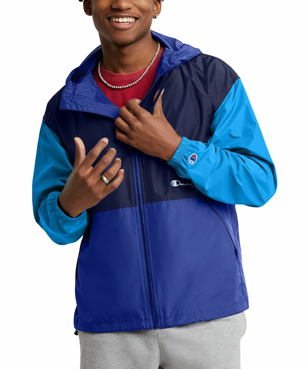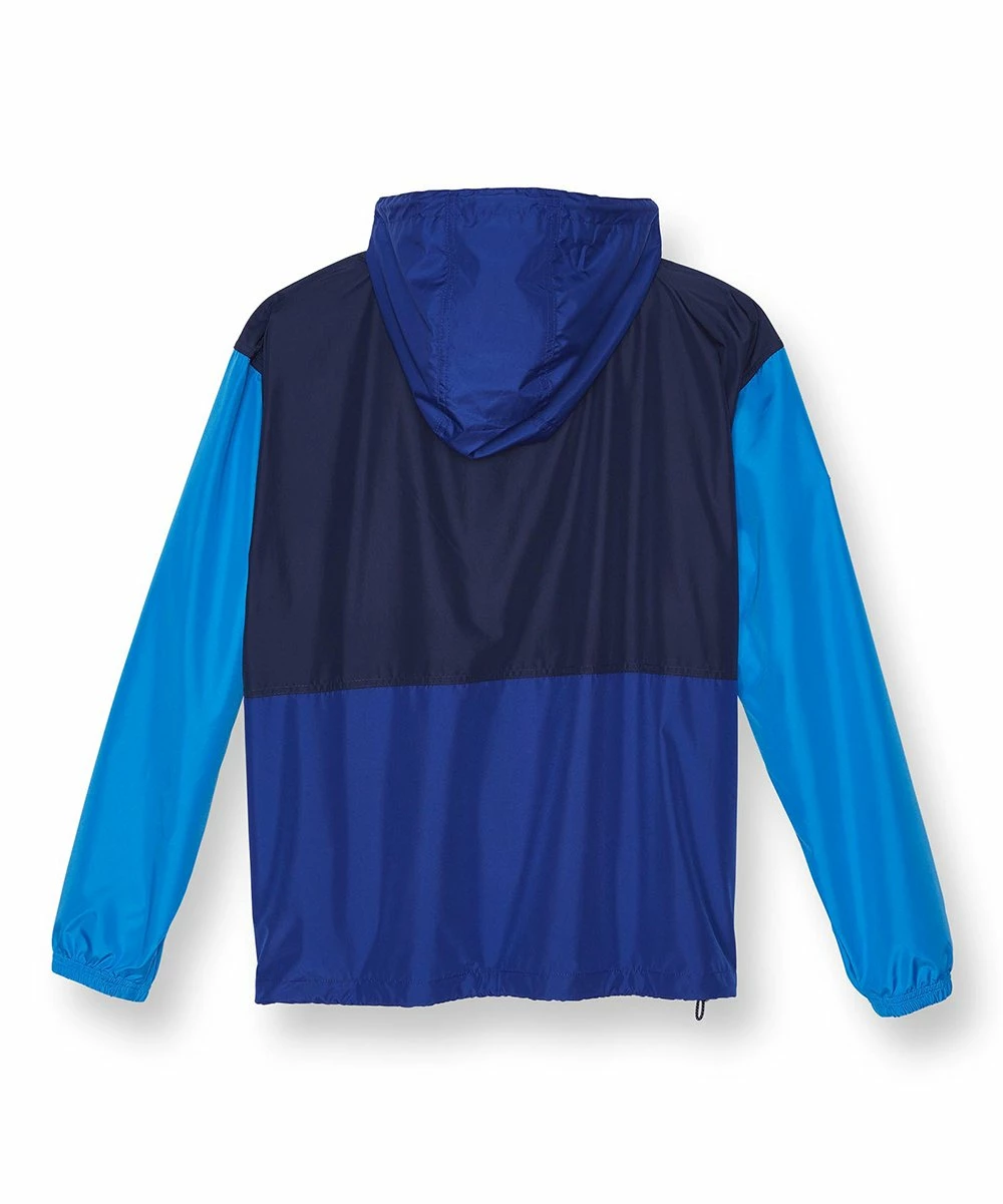 Bold color-blocked windbreaker that’s resistant to rain and wind. Zip closure, adjustable drawstring hood and hem, welt side pockets.