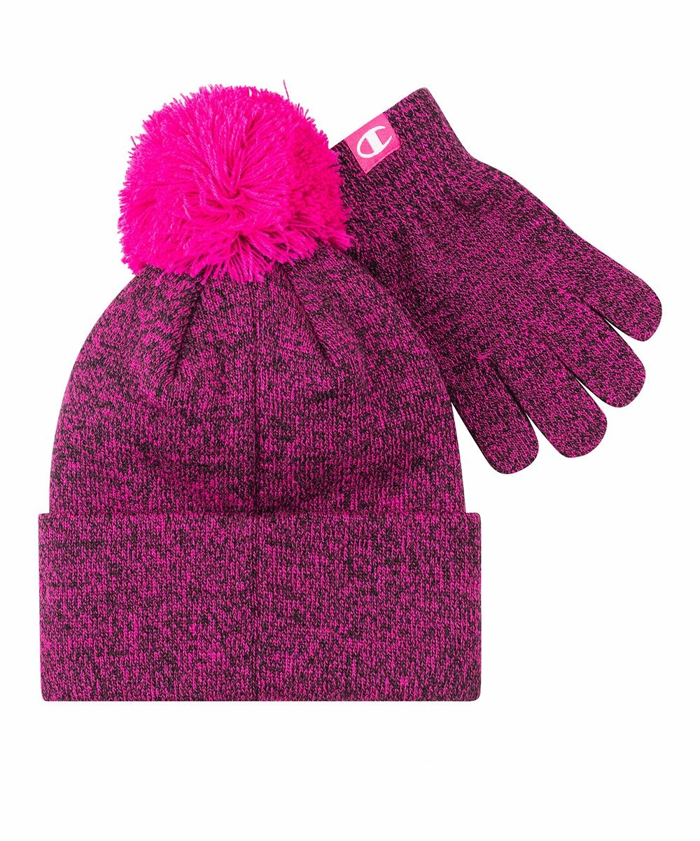 Budget πŸ›’ Champion Black & Pink Fizzy Pom-Pom Beanie & Gloves 🎁