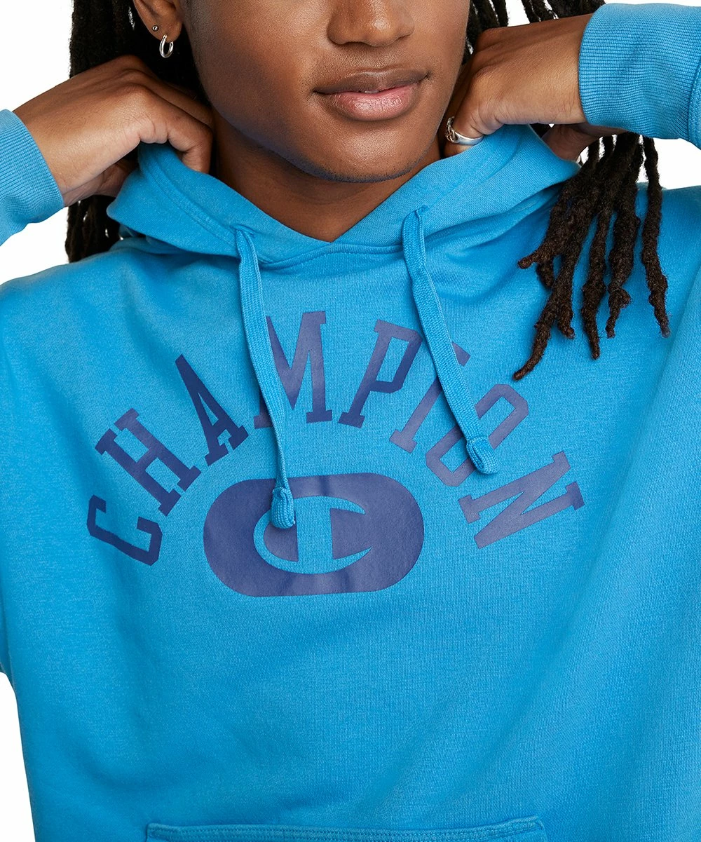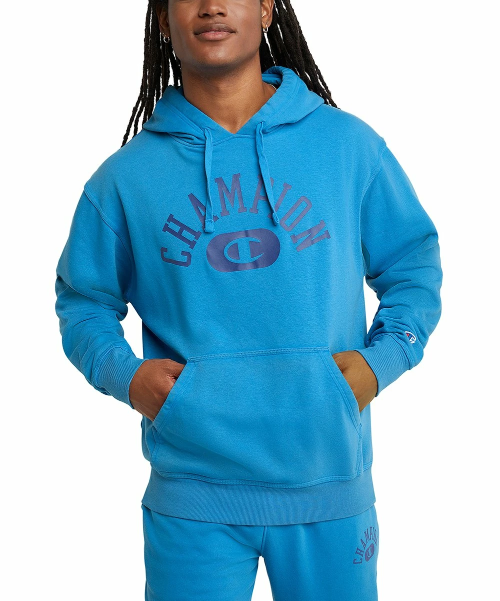 Vintage-washed pullover with a double-stitched drawstring hood, centered varsity logo, ribbed cuffs and a lay-flat hem. Front pouch pocket and standard fit.