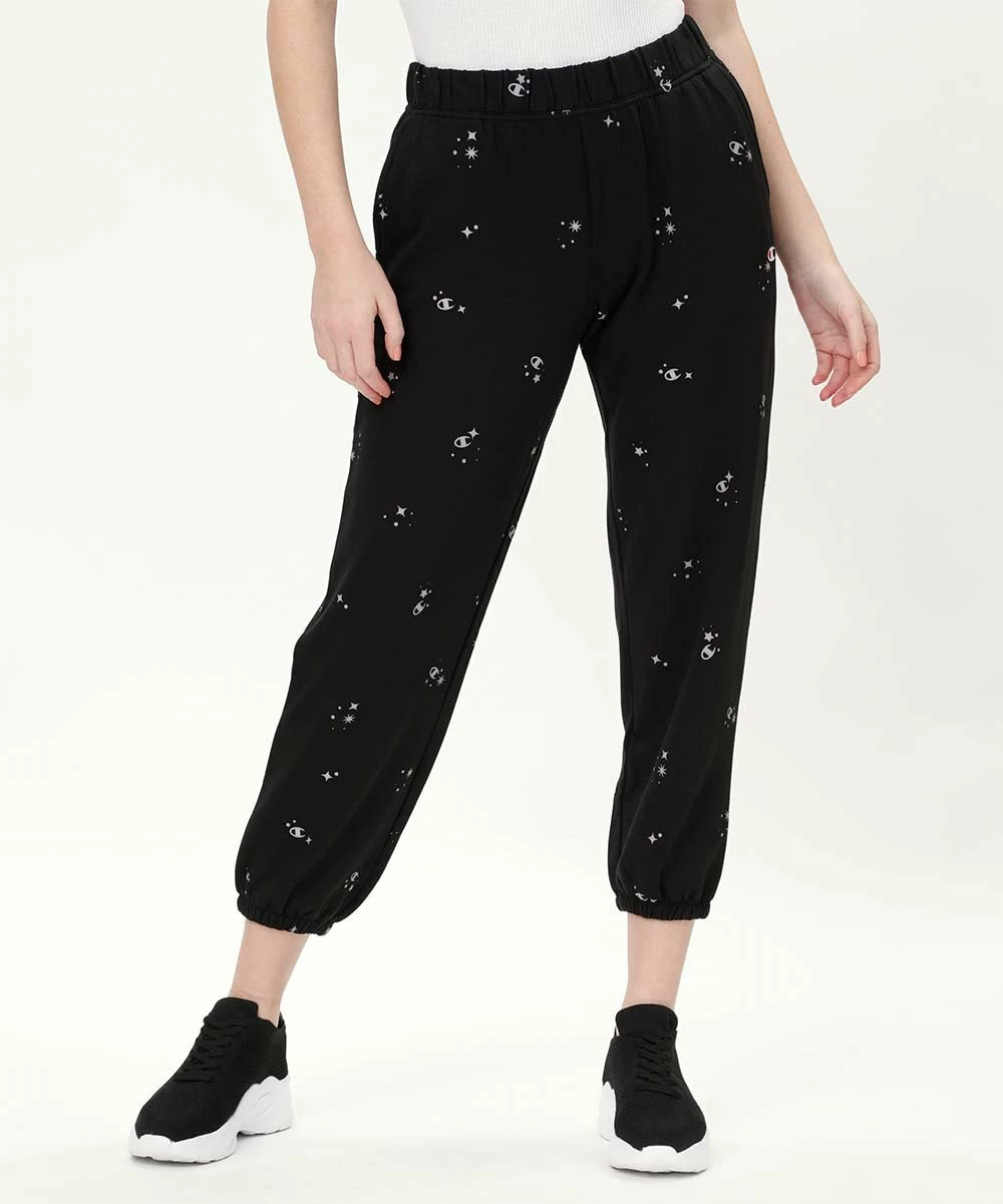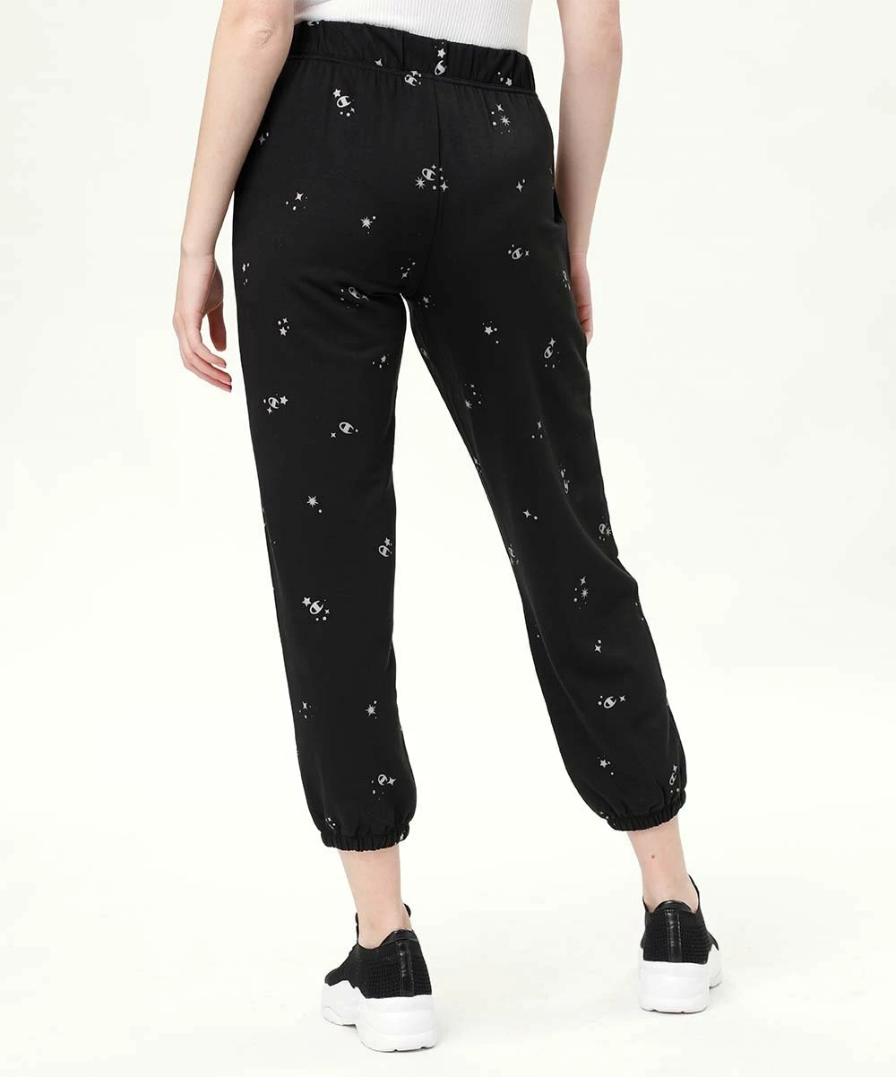 Sweatpants have an elastic waist and brushed fleece feel for casual-comfortable appeal. All-over logo pattern adds to the look.