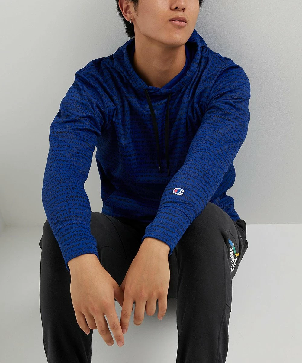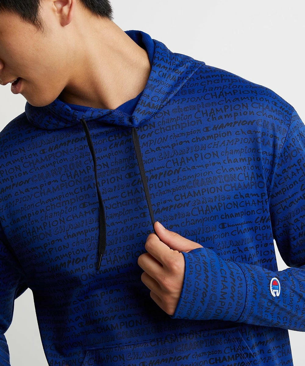 Stretch-blend pullover featuring thumbholes, a kangaroo pocket and drawstring hood.