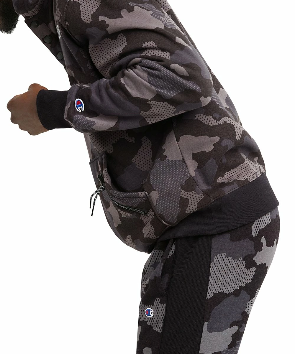 This hoodie features a button placket, chest logo and kangaroo pocket. Made of a cozy fleece.
