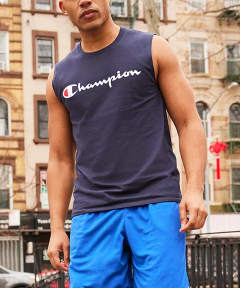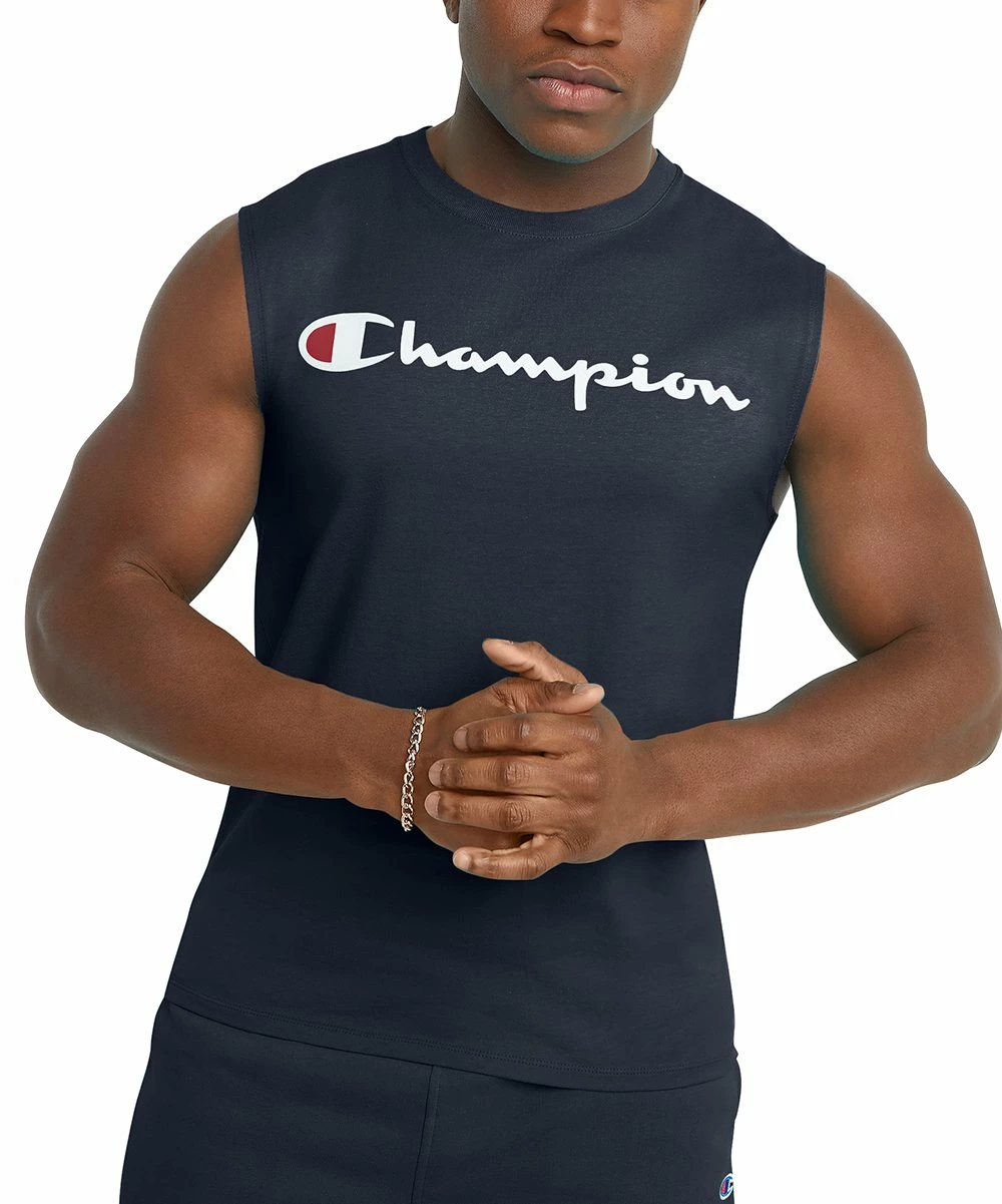 Soft cotton-blend muscle tee made with a ribbed crewneck, reinforced shoulder seams and extra stitch count for durability. Single needle stitching at arm openings and bottom hem provides a clean finish.