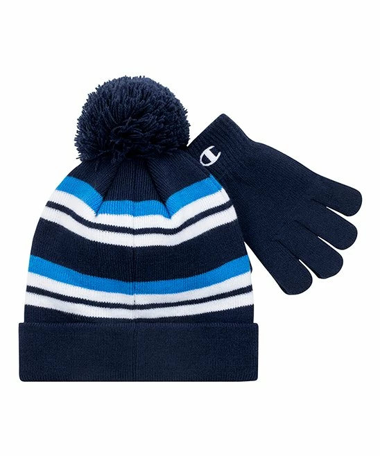 - Includes navy and white stripe beanie and navy gloves (three pieces total)