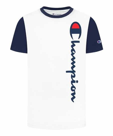 Tee featuring a bold color block print, a classic crewneck collar and soft cotton-blend fabric.