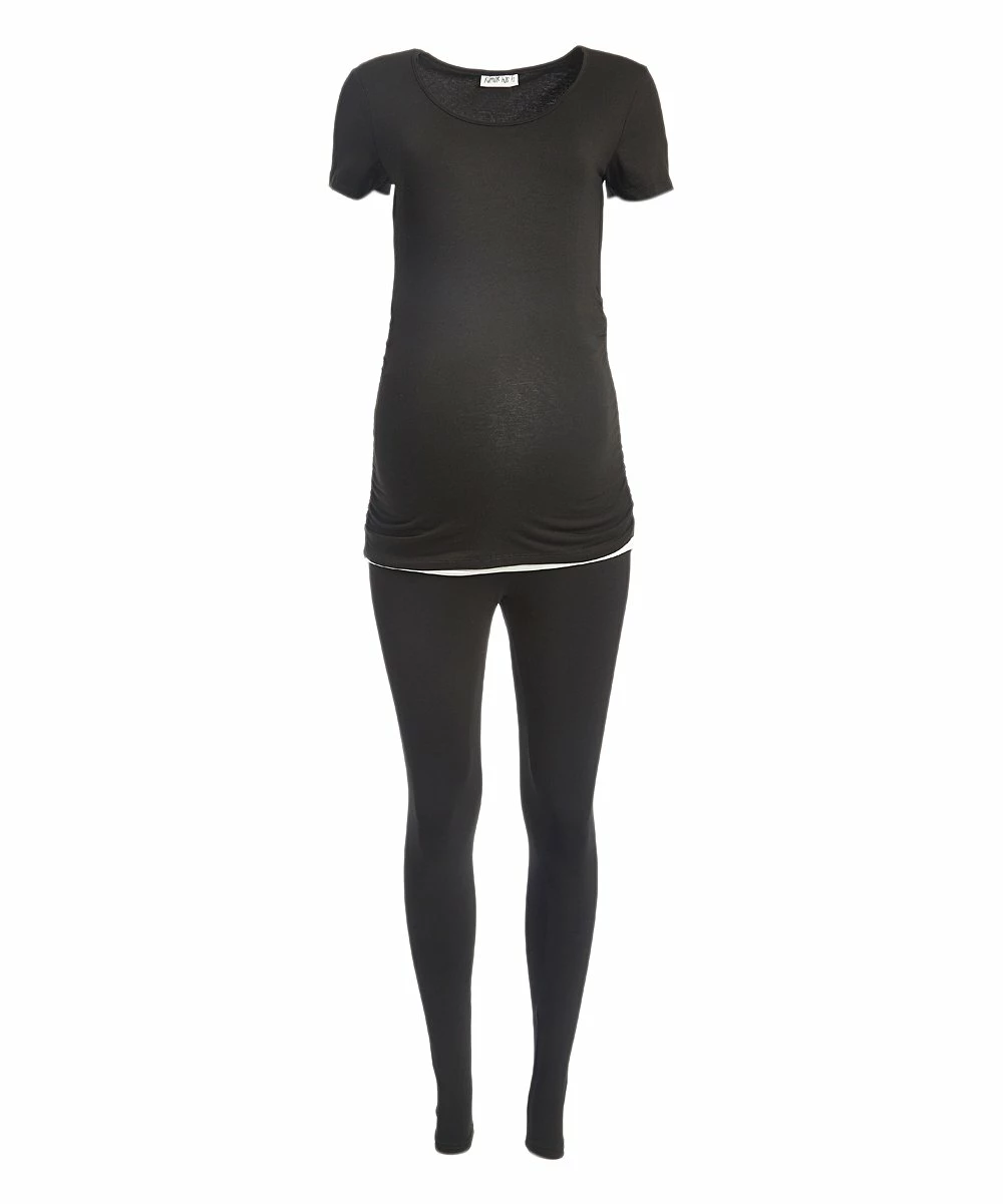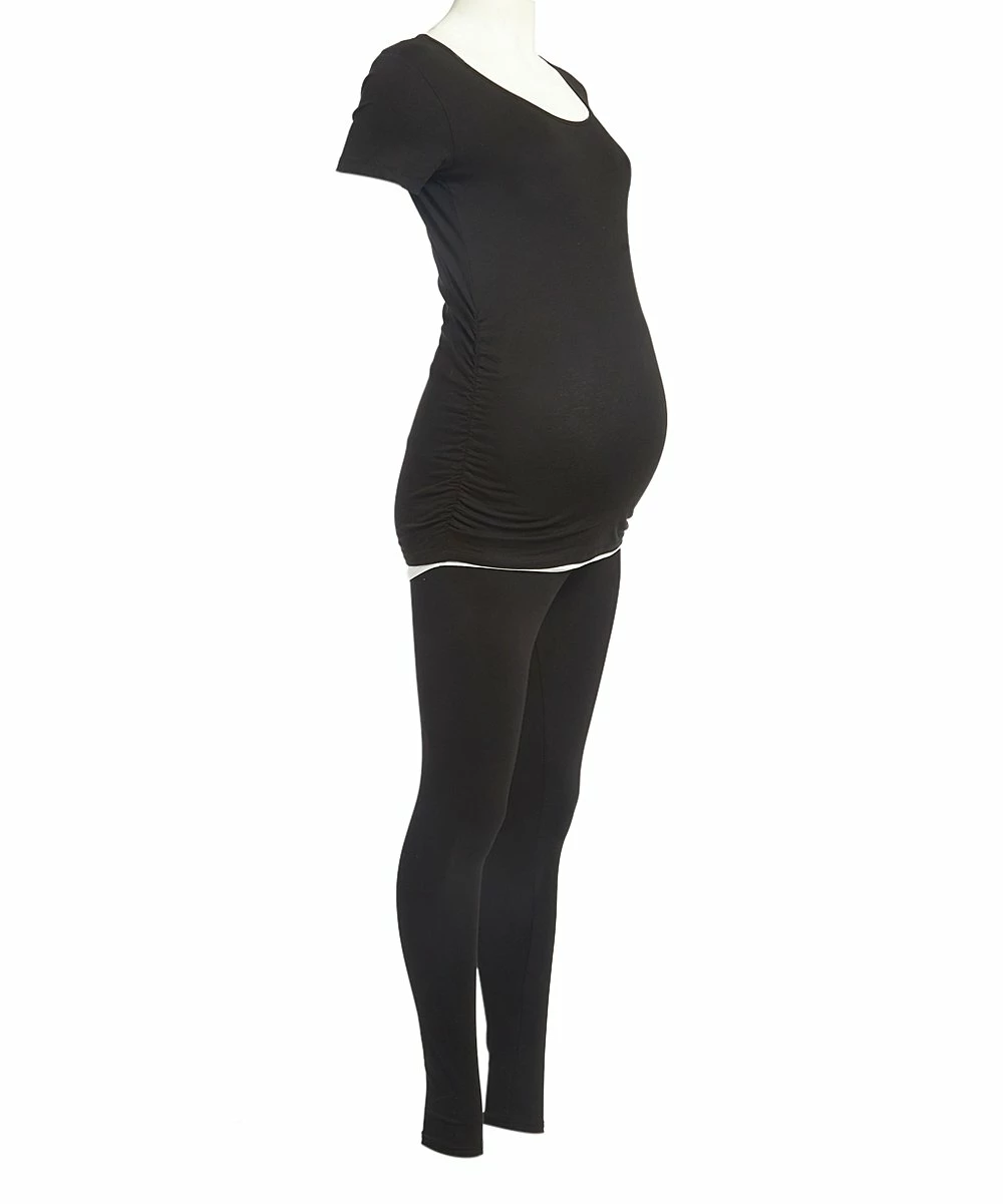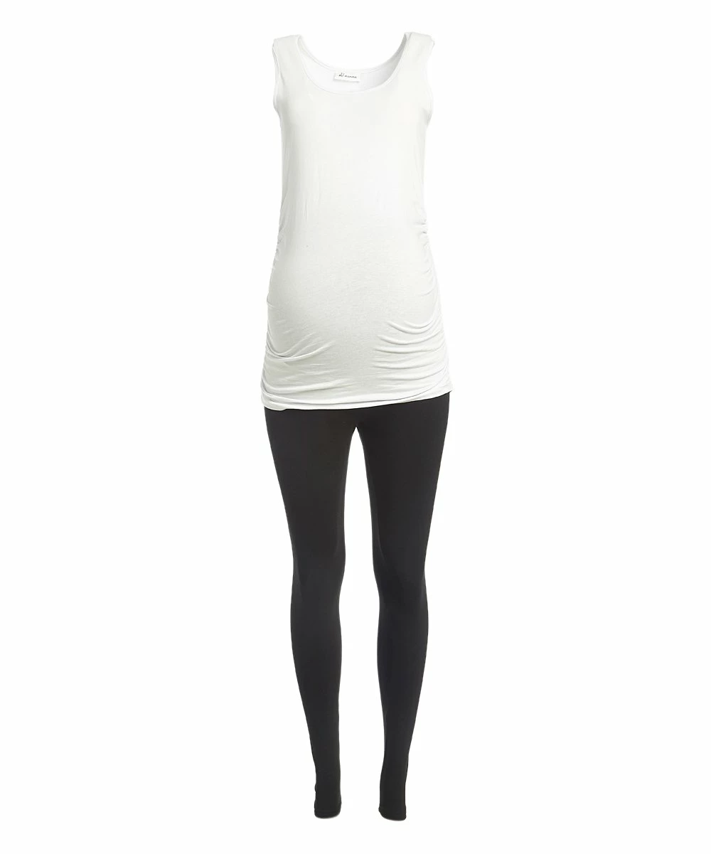 - Includes one white ruched-side maternity tank, one black ruched-side short-sleeve top and one pair of black over-belly leggings (three pieces total)